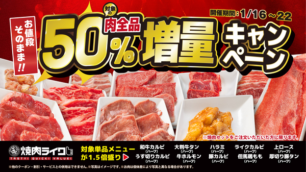焼肉ライクは、1月16日から22日の期間限定で「お値段そのままで肉50%増量」キャンペーンを実施する。