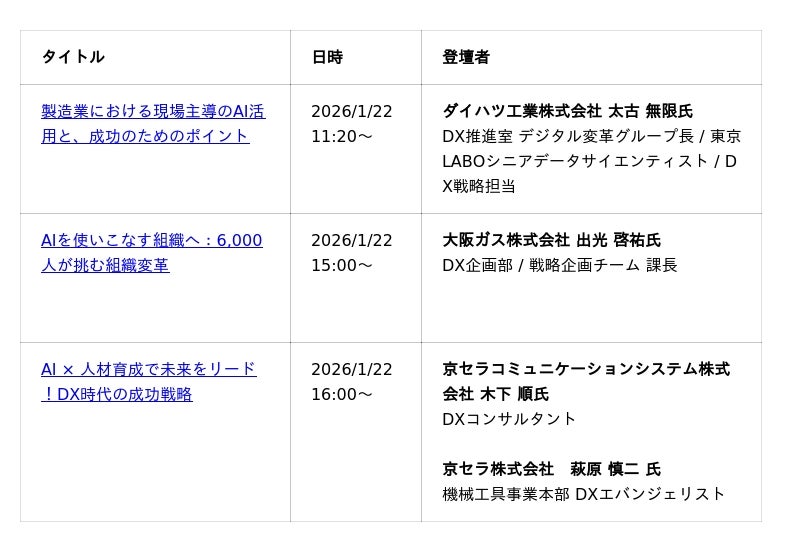 業界を牽引するトップランナーが登壇し、AI活用の最新トレンドから実践的なノウハウまでを幅広く共有します。AI導入を検討中の企業から、さらなる活用を目指す企業まで、有益な情報を得られる内容となっていますので、ぜひご参加ください。