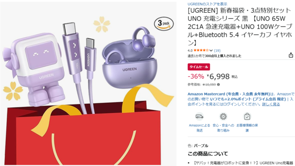 「UGREEN 新春福袋・3点特別セット」の参考価格は10,959円ですが、セールでは36%オフの6,998円という割引価格で手に入ります。