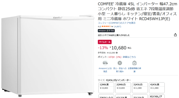 「COMFEE' 45Lミニ冷蔵庫」の参考価格は12,280円ですが、セールでは13%オフの10,680円という割引価格で手に入ります。
