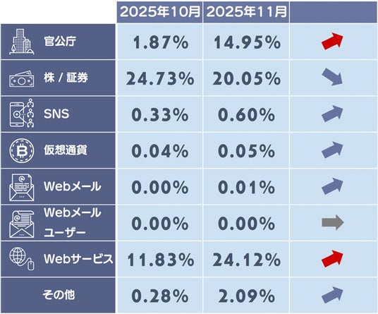 また、Webサービスカテゴリについても、Vpassのフィッシングサイト増加により構成比が上昇しています。