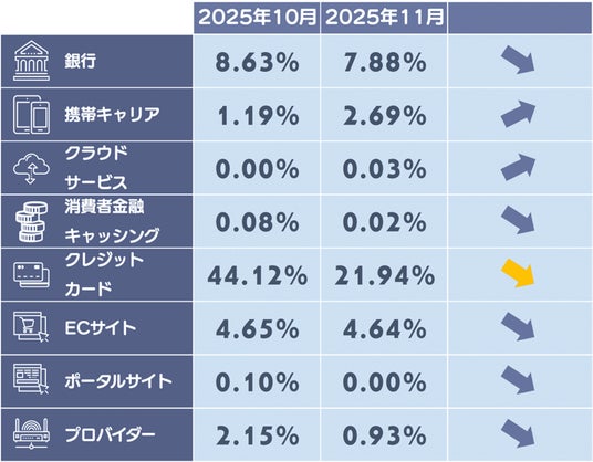 また、Amazonをかたるフィッシングサイトが11月末頃から増加傾向にあり、ブラックフライデーやボーナス商戦を狙った可能性が考えられます。さらに、UCカードやOricoなど、クレジットカード系のフィッシングサイトも増加しており、引き続き警戒が必要です。