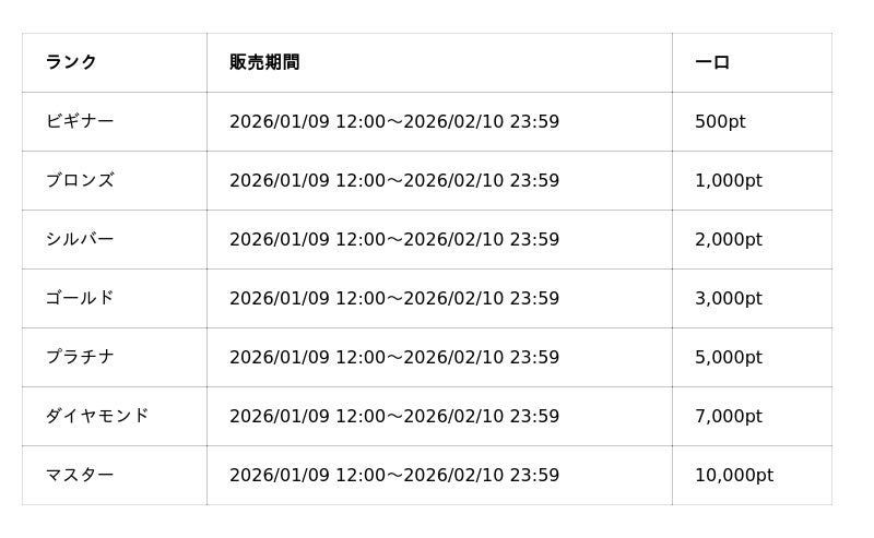 ※2026年1月8日12時時点でのランクが各ランクガチャの対象となります。期間中にランク昇格された場合も、対象ガチャとなったガチャを販売終了日まで引続きご利用いただけます。