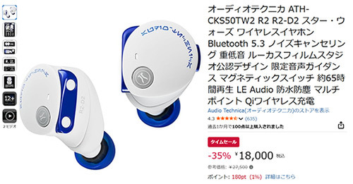 【Amazonタイムセール】Audio Technica 完全ワイヤレスイヤホン「ATH-CKS50TW2 R2(R2-D2モデル)」登場!