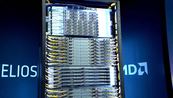 基調講演で公開されたHeliosの実機。以前の記事でInfinityFabric Switch×9と書いたが、どう見ても6本しかスイッチがない。NVL72の構成に引っ張られすぎでつい9本と書いてしまった