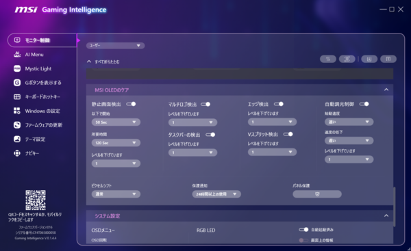 また、焼き付きリスクに特化した機能として、従来の「MSI OLED Care 2.0」と同等の機能が搭載されている。「ピクセルシフト」「静止画検出機能」「エッジ検出」「タスクバー検出」「マルチロゴ検出」などのほか、「パネル保護」として24時間ごとのパネルリフレッシュ機能の実行。長時間のプレイでも中断されることなくパネルを保護してくれる。