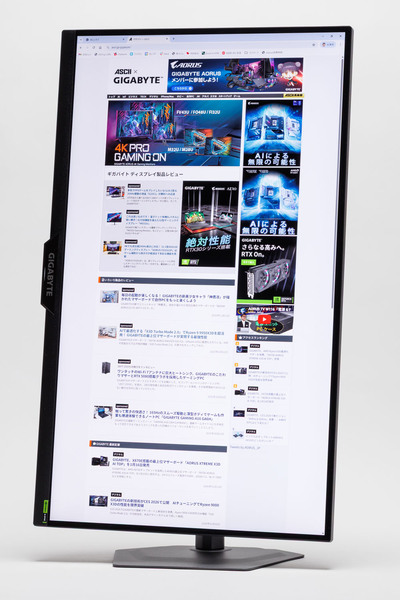 スタンドのエルゴノミクスも秀逸だ。基本となる高低移動と、上下左右の首振りに対応。長時間のPC作業でも疲れにくい姿勢を保てる。また回転させて縦置きにできるピボットにも対応しているので、ビジネスシーンでも活用できるだろう。