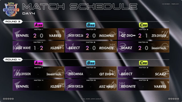 なおROUND 3の試合結果ですが、FENNELが2-0でVARRELに勝利、ENTER FORCE.36が2-0でINSOMNIAに勝利、QT DIG∞が2-1でZETA DIVISIONに勝利、REJECTが2-0でREIGNITEに勝利、SCARZが2-0でDetonatioN FocusMeに勝利となっています。
