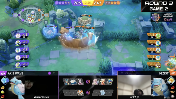GAME 1では、集団戦でAXIZ WAVEが冷静に対処。新たに使用可能になったシャワーズを効果的に使うなどして、ジリジリとした試合展開を勝ち切ります。