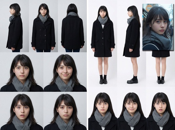 同じように、ChatGPTに分析させ、特徴を抽出し、それをプロンプトとして追加したうえで、三面図と表情差分を出力しました。特徴として出てきたプロンプトは以下です。