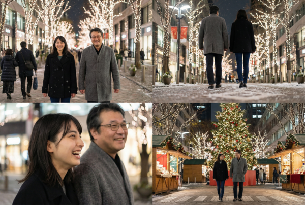 こうした基準となる参照画像を使って、今度は筆者の画像と明日来子さんの三面図を使って、クリスマスデートに出かけていたという想定で画像を作ってみました。女性が横にいたさいに、筆者のだらしない顔が微妙に似ている気がしなくもなく、正直笑えます。2人の画面を指定すると、すぐに手をつないだ画像が出てくるので、「手を繋ぐな」という指示はしています。