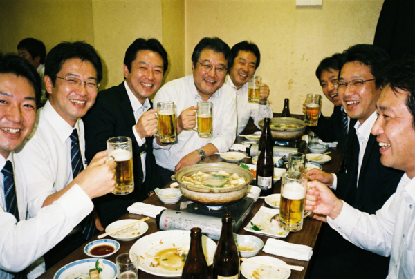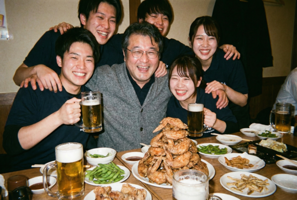 <プロンプト>画像1の人物を中心に経営者たちが、ざっくばらんな居酒屋の飲み会会場で、集合写真を作ってください。卓の上には鍋や、ビールジョッキがあります。低画質な使い捨てカメラで撮影した1枚の日常写真。日本の高校生が撮影した下手くそな写真。画像1の男性は少し太っています。