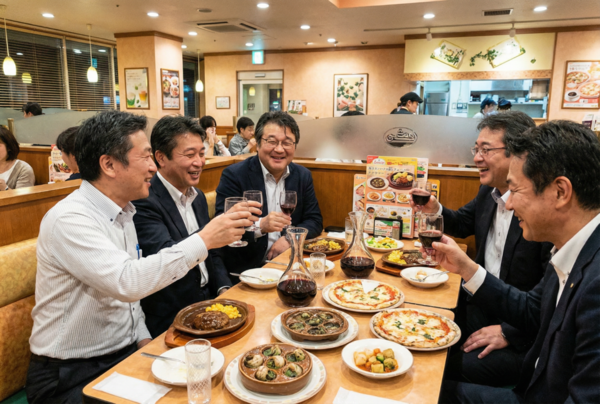 今度は年末年始にかけて、様々な意味で話題を呼ぶことになったXの「Grok Imagine」を使っても試してみます。Grokの強みはとにかく生成速度が速いということです。冒頭の画像を使って、新年会の様子に変えるように指示しました。具体的には、和服にして、食事をお正月風のものにと、何回か修正をテキストで指示した結果、以下の画像になりました。