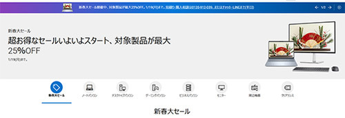 Dell公式サイトでは「新春大セール」を開催中。ノートPC、デスクトップ、ゲーミングPCを中心に、対象製品が最大25%オフとなっています。セールは2026年1月19日まで。