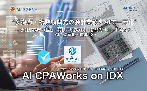 AIデータ株式会社は1月7日に、会計事務所・税理士法人・監査法人向けに、会計・税務・顧問対応の生産性向上を図る業界専用AI「AI CPAWorks on IDX」の提供開始を発表した。帳簿・決算書・証憑類・税務相談・内部監査といった業務において、業務の属人化を防ぎながら、品質・スピード・証跡を強化できるAI基盤だという。