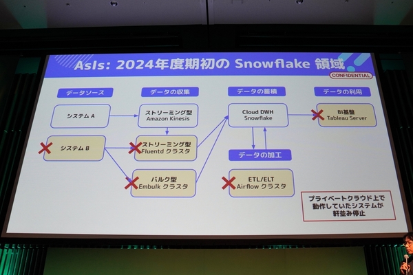 まず、Snowflakeのプライベートクラウドで稼働していたのは、データ収集用のFluentdクラスタ(ストリーミング型)やEmbulkクラスタ(バルク型)、データ加工(ETL/ELT)用のAirflowクラスタ、そしてBI基盤であるTableau Serverだ。