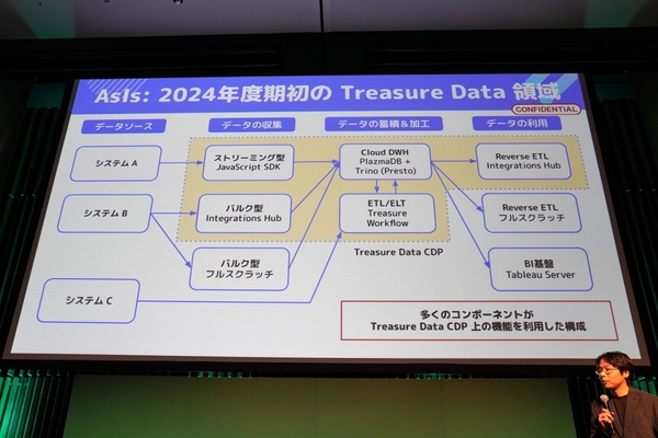 一方、Snowflakeに統合するTreasure Dataでは、データ収集向けにJavaScript SDKによる接続(ストリーミング型)や純正データコネクターである「Integrations Hub」(バルク型)を、ETL/ELT向けにTreasure Workflowを採用するなど、大部分をTreasure Dataの機能で構成する形を取っていた。