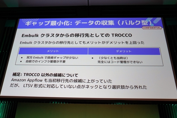 TROCCOに関しては、サイバー攻撃前から、Treasure Dataのデータコネクターからの有力な移行先として検証していたという。従来通りにWeb UIで設定できて利用感のギャップがなく、内部エンジンもEmbulkで変わらず、技術的なギャップも小さい。そして、Amazon S3やMarketo、SFTP、BigQueryといった想定するワークロードに対応するコネクタも標準で用意されていた。