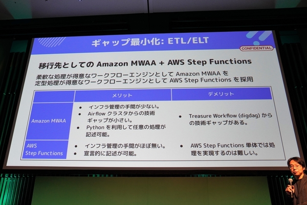 Amazon MWAAは、Treasure Workflowからの移行ギャップはあったもの、マネージドでインフラ管理の手間が少ない点や、Airflowクラスタからの技術ギャップの小ささから決定した。AWS Step Functionsは、「MWAA以上に管理の手間が少ないのが大きなメリット」と中野氏。宣言的に記述が可能な点も決め手になったという。