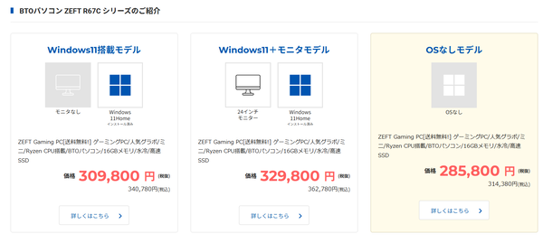 調べてみるとこのOSなしモデル、Windows 11 HomeをプリインストールしたZEFT R67C(直販価格は税込み34万780円)よりも2万6400円「も」安いではないか。メモリーやらストレージが高騰しているご時勢でこの差は案外大きいかもしれない。