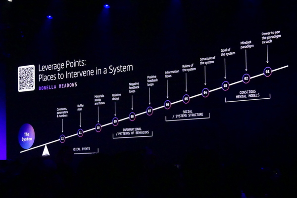 メドウズはこれを「レバレッジポイント:システムに介入する場所」という論文にまとめた。私たちのようなコンピューターサイエンスに関わる人が日常的に耳にする言葉に、正のフィードバックループと負のフィードバックループがある。この論文は読むべきだ。これを宿題と呼ぶ」とボーガス氏は、QRコードを示した。
