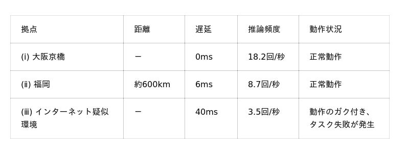 ロボットの推論処理は、カメラ映像を都度データセンターに送信し、処理結果を受け取る仕組みであるため、ネットワーク帯域と遅延が推論頻度(単位時間あたりの推論回数)に直接影響します。その結果、以下のような差異が確認されました。
