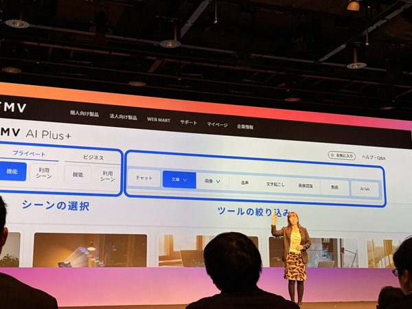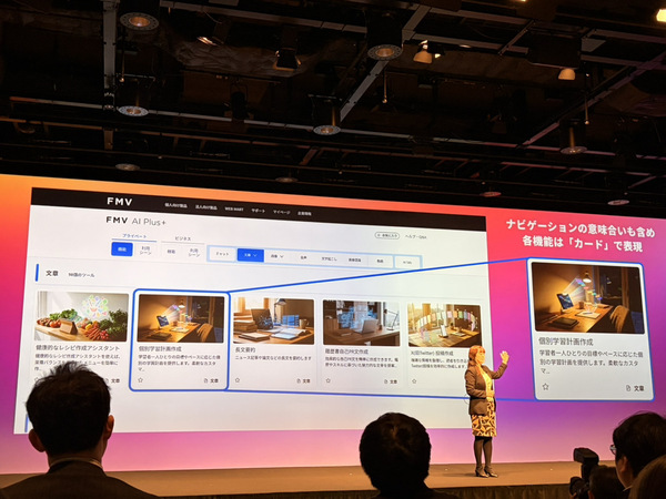 発表会で強調されたのは、FMV AI Plus+が単なるAIジェネレーターの集合ではない点だ。利用者の目的や場面に合わせて、最適なAI機能や活用例を自動で提案してくれる仕組みが組み込まれている。