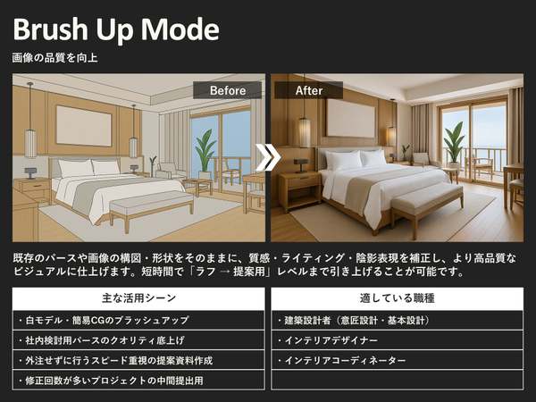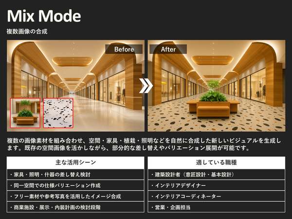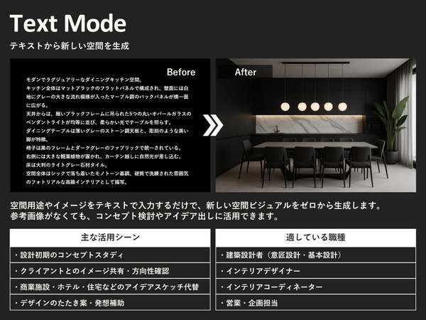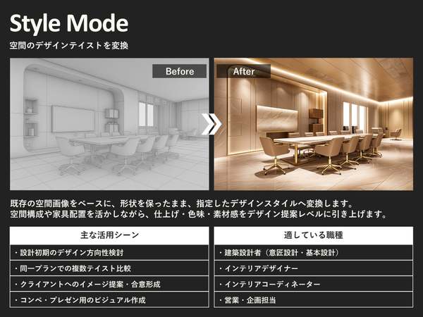 今回のアップデートでは、従来の「Style」モードに加えて、新たに4つのモードを追加。既存パースや写真の質感・光表現の向上、複数画像の合成、テキストや参考画像による部分修正、テキスト入力のみでの空間イメージ生成など、用途に応じて機能を使い分けることで、より柔軟で効率的なビジュアル制作が可能になるとしている。