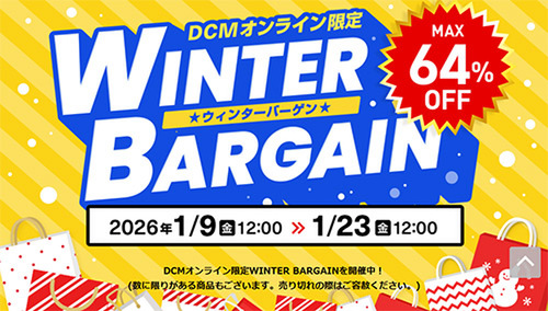 DCMオンラインでは、「ウィンターバーゲン」を開催中です。季節家電や生活用品などが対象で、最大64%オフの商品も用意されています。セールは2026年1月23日12:00までとなっています。