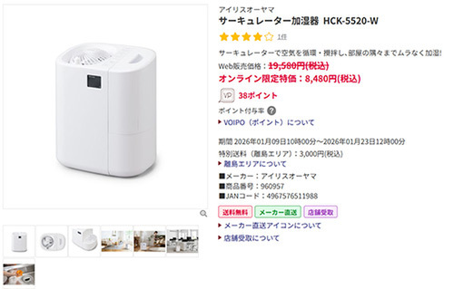 アイリスオーヤマ サーキュレーター加湿器 HCK-5520-W