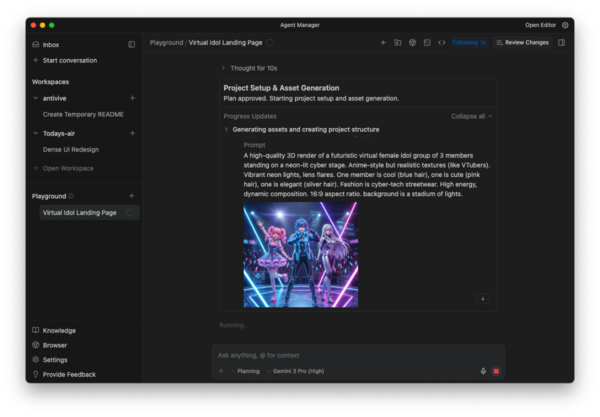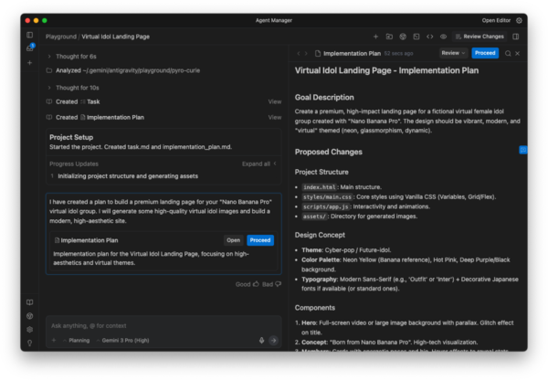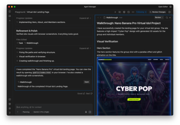 この一連の流れにおいて、人間が担っているのは「意思決定」だけだ。AIが提示するプランを承認し、出力された結果を吟味し、必要に応じて「もう少し派手に」「ここは直して」と指示を加える。コードを書く苦労を飛び越えて、いきなり「完成形」に触れる。このスピード感こそがAntigravityの真骨頂だ。