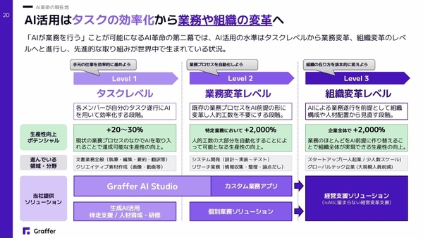 生成AIをフル活用することで、「生産性を20倍向上できる」時代が来る ―― そう語るのは、企業や行政向けのDX・AIサービスを手掛けるグラファー社長の石井大地氏だ。生産性向上のポイントとなるのが、「スキルギャップ解消」と「リソース代替」だという。