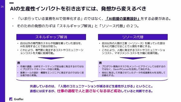 石井氏は、さらに一歩踏み込み、AIで生産性が向上するメカニズムを分析している。ポイントとなるのが「スキルギャップ解消」と「リソース代替」だという。
