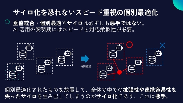 ただ、個別最適ゆえにどうしてもサイロ化が生じてしまうが、それを恐れず対応柔軟性を持たせることが重要になる。「サイロ化の何が問題かというと、拡張性や連携容易性を失わせたまま放置してしまうこと」(山下氏)
