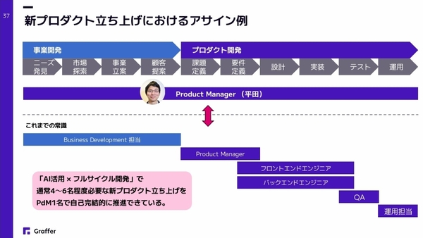 実際にグラファーのプロダクト開発では、全メンバーが課題発見から要件定義、設計、実装、テスト、運用まで、全行程を担当する“フルサイクル+AI活用”な開発を実践している。チームの構成は、バックアップを考慮した2名体制にまで減らし、コミュニケーションラインと会議体を大幅に削減する形だ。石井氏は、「あらゆるシステム開発プロジェクトは2名体制が理想になるのでは」と語る。