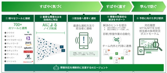 「PagerDuty Operations Cloud」は、システム障害などのインシデント発生時に、AIによるノイズ(不要なアラート)削減や復旧作業の自動化を行うことで、企業におけるIT運用の効率を向上させるソリューションです。