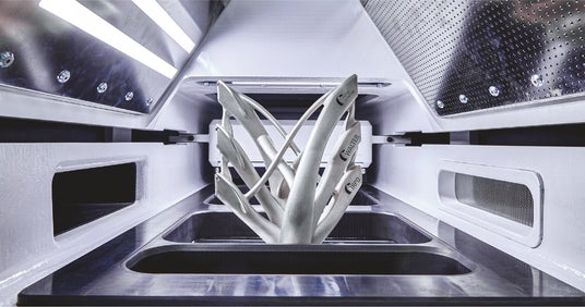 IMPACT 4530積層造形機の造形エリアと完成品の金属部品。(写真提供:ベッコフオートメーション)
