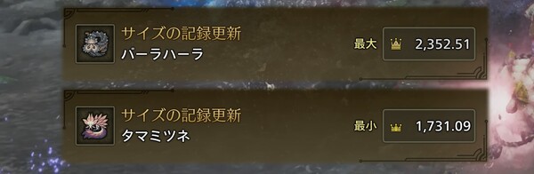 「はりきりモリバーα」はこれまでにない装備で、可愛いと注目を集めている。クエストは「タマミツネ」と「バーラハーラ」の同時狩猟で、実際にやってみたところ最小・最大金冠となっていた。