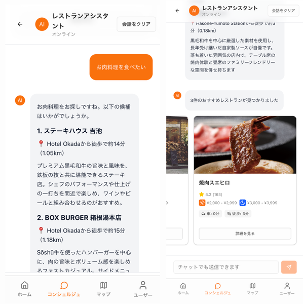 同社によると、箱根エリアではインバウンド旅行者の増加とともに、素泊まりや一泊朝食プランの利用が増えているという。宿泊施設における調査では、インバウンド旅行者の約7割が夕食なしプランを選択しているとのこと。その背景には「飲食店の情報が足りておらず、予約方法が分かりにくい」、「言語の壁により予約を断念してしまう」などの課題があるそうだ。こうした背景を受けてTripXと箱根DMOでは、飲食店の検索から比較、予約の手間を減らすことをコンセプトに、AIによる代理予約・レコメンド機能を備えたサービスの開発・実証を進めてきたという。