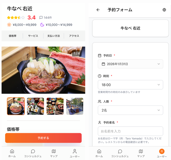一部の提携店舗ではサービス上から予約が可能。インバウンド旅行者にとってハードルの高かった「電話予約が必要な店舗」について、AIが電話予約を代行するという。言語の壁や電話対応への不安から訪問をあきらめていた飲食店への予約を可能にし、インバウンド旅行者の体験価値を広げるとしている。