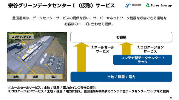 今回発表された宗谷グリーンデータセンターⅠは、9900平米の敷地に1階建(平屋)のドーム型建屋を設置する、受電容量3メガワット(3MW)の小規模データセンターとなる。ユーラスエナジーがインフラ部分(土地、建屋、電力設備)の運営を、豊田通商がコンテナ型データセンターやIT設備の運営、およびサービス提供、営業活動を担う。今後、顧客の需要を見ながら、ホールセールおよびコロケーション(コンテナ型データセンター)のサービスを行う予定。
