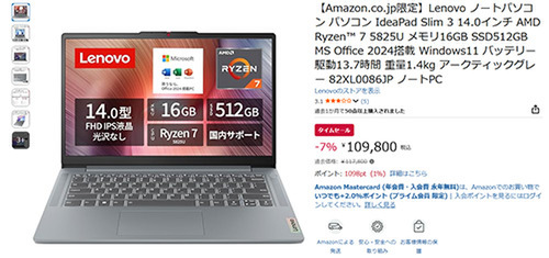 14.0型FHD IPS(非光沢)に、Ryzen 7 5825Uと16GBメモリを組み合わせ、Office 2024も最初から利用可能。タイムセールで7%オフの109,800円になっています。