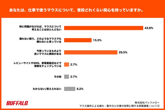 バッファローの独自調査※によると、デスクワーカーの7割以上が1日6時間以上マウスを使った作業を行っています。長時間のマウス操作で「身体の疲れ」を感じる人は約半数、「心理面」「業務効率面」での影響も4割以上の方が実感していながら、約6割がマウス選びに無関心であるという実態がわかりました。