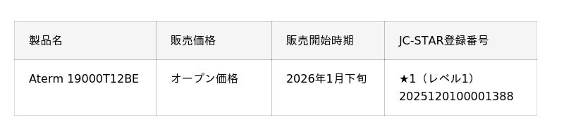 NECプラットフォームズは、最新の無線通信規格Wi-Fi 7に対応した12ストリームのWi-Fiホームルータ「Aterm 19000T12BE」を2026年1月下旬より販売開始します。