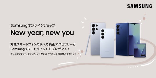 サムスン電子ジャパン株式会社は、本日より、当社公式サイト「Samsungオンラインショップ」(https://www.samsung.com/jp/offer/)にて、対象スマートフォン製品※をご購入で純正アクセサリーと還元されるリワードポイントを追加でプレゼントする「Samsungオンラインショップ New year, new you」を開催いたします。さらに対象のタブレット・ウェアラブル製品を同時にご購入いただきますと同時購入製品が最大20%オフとなります。開催期間は、2026年1月15日(木)10:00 ~ 2月5日(木)9:59です。
