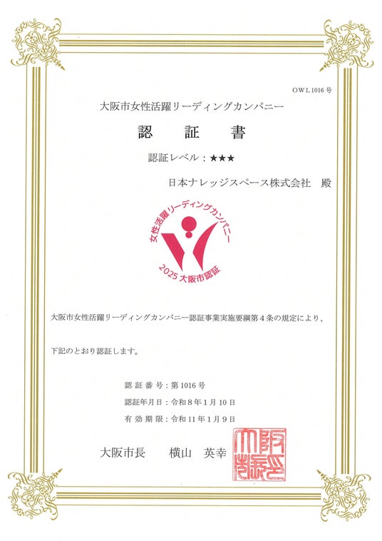 Webシステム開発・インフラ構築等のITソリューション事業を展開する日本ナレッジスペース株式会社(本社:東京都港区、大阪支社:大阪市北区、代表取締役:松岡 竜邦、以下「当社」)は、この度、大阪市が認定する「大阪市女性活躍リーディングカンパニー」において、最高ランクである「三つ星認証(★★★)」を取得いたしました。
