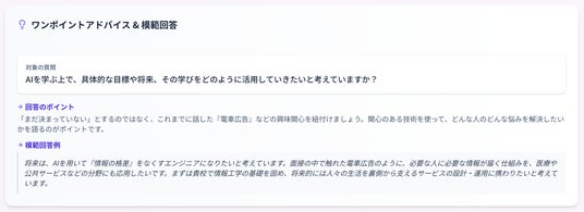 【ワンポイントアドバイス&模範回答】 改善が必要な質問については、AIが「回答のポイント」と「模範回答例」を提示します。自分の回答と比較しながら、より効果的な伝え方を学ぶことができます。