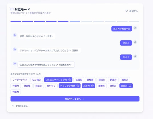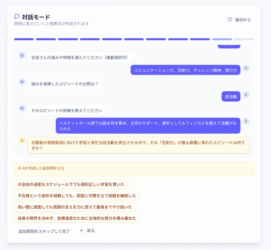 対話型のステップでは、単一的な選択肢に限らず、その生徒の特徴を深堀ったオリジナルの質問をAIが生成し、指導教員が回答することで、より生徒の特徴を活かした推薦文のたたき台を生成可能に。