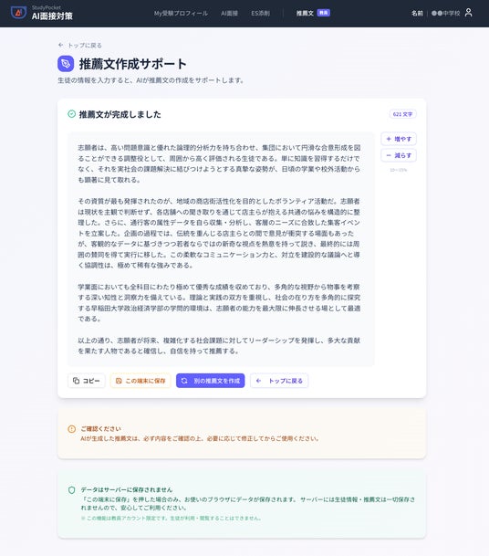文部科学省「教育情報セキュリティポリシーに関するガイドライン(令和7年3月)」に定められた重要資産の取り扱いに関わるクラウドサービスの観点、ならびに「初等中等教育段階における 生成 AI の利活用に関するガイドライン」の趣旨に基づき、当社サーバーには生徒情報・推薦文の情報は一切保存されず、生成AIの推論時にも学習情報としてオプトアウト設定されています。