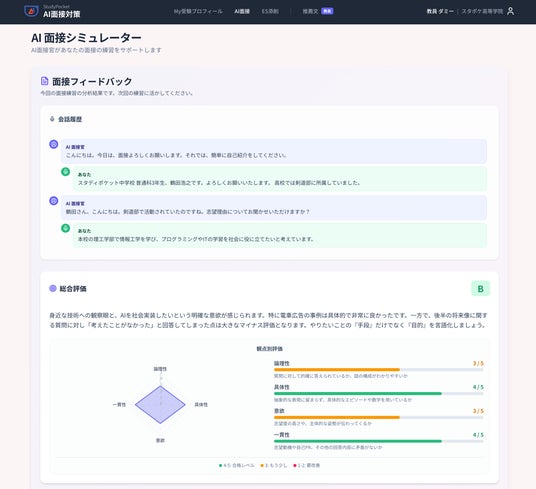 こうした課題に対し「スタディポケット AI面接対策」は、AIがリアルな面接官として生徒の練習相手になることで、いつでも・何度でも面接練習ができる環境を実現しました。さらに、あらかじめ設定しておいた志望動機や自己PRなどの出願書類の内容、志望先のアドミッション・ポリシー(ある場合)に基づいた面接が行われます。これらの書類をAIが添削する機能も搭載し、面接と書類の両面から出願準備をサポートします。